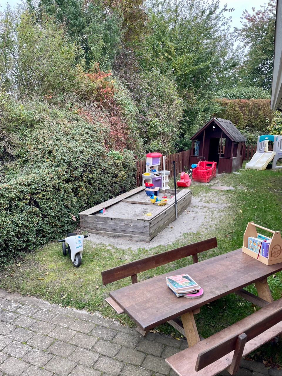 Vi er meget ude at lege. Børnene har f.eks. mulighed for sanselege i sandkassen, rollelege i legehuset, lege med blade i efteråret.